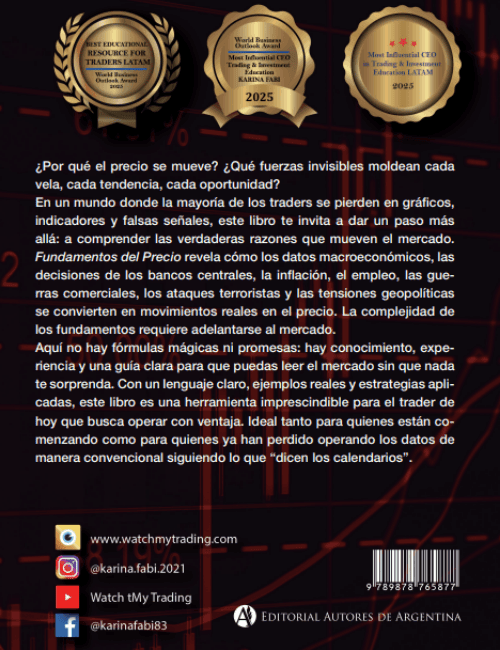 Karina Fabi, fundadora de WatchMyTrading y con más de 15 años de experiencia en los mercados financieros, revela en esta obra cómo los datos macroeconómicos, las decisiones de los bancos centrales, la inflación, el empleo y las tensiones geopolíticas se convierten en movimientos reales en el precio.